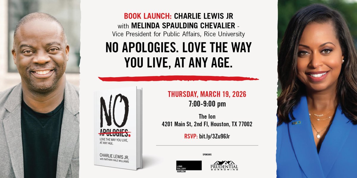 Experience an uplifting conversation with award-winning real estate expert and lifestyle guide Charlie Lewis Jr., Author of No Apologies. Love the Way You Live, at Any Age, and Melinda Spaulding Chevalier,Vice President Public Affairs, Rice University